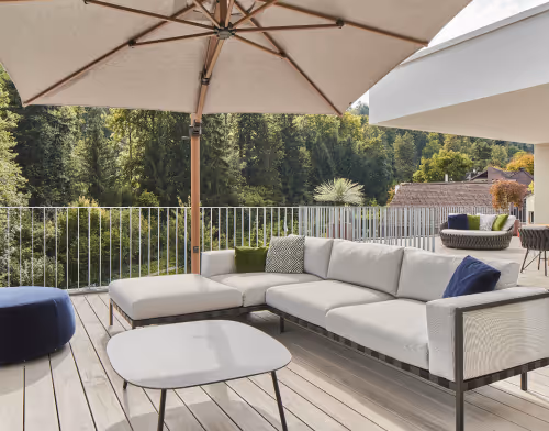 Jede Wohnung verfügt über einen grosszügigen Aussenbereich: Privatgärten im Erdgeschoss, überdachte Terrassen in den Obergeschossen und grosszügige Dachterrassen im Attikageschoss laden zum Entspannen unter freiem Himmel ein.