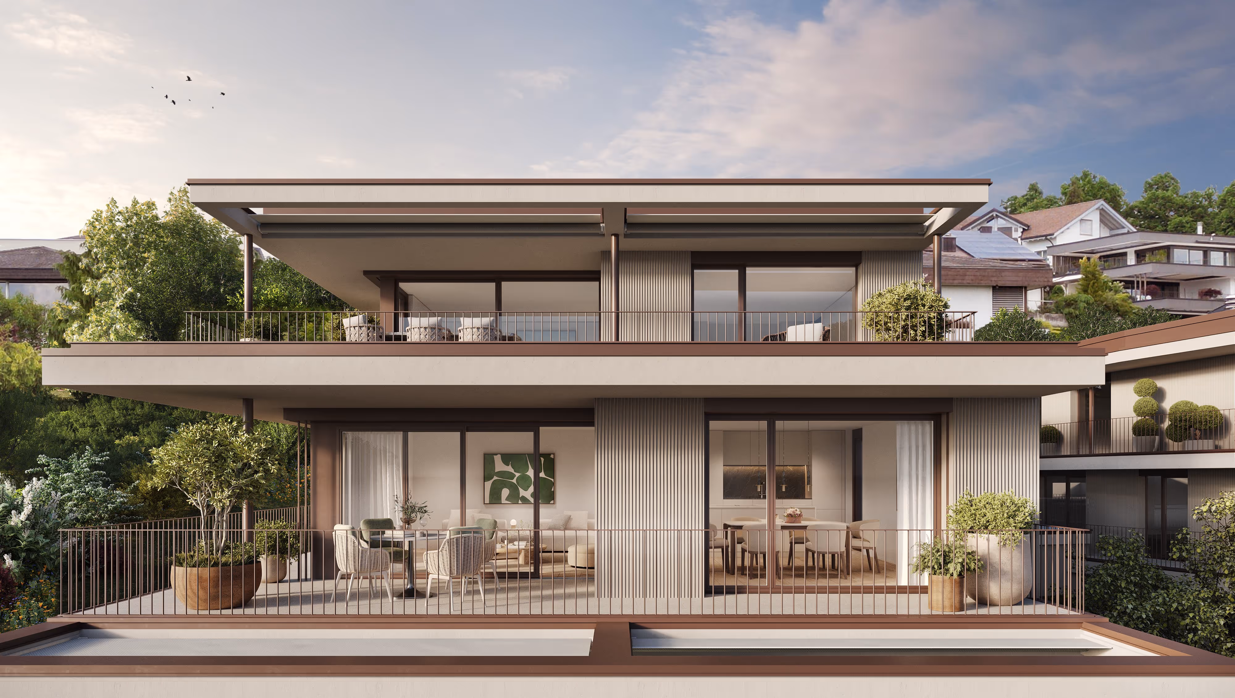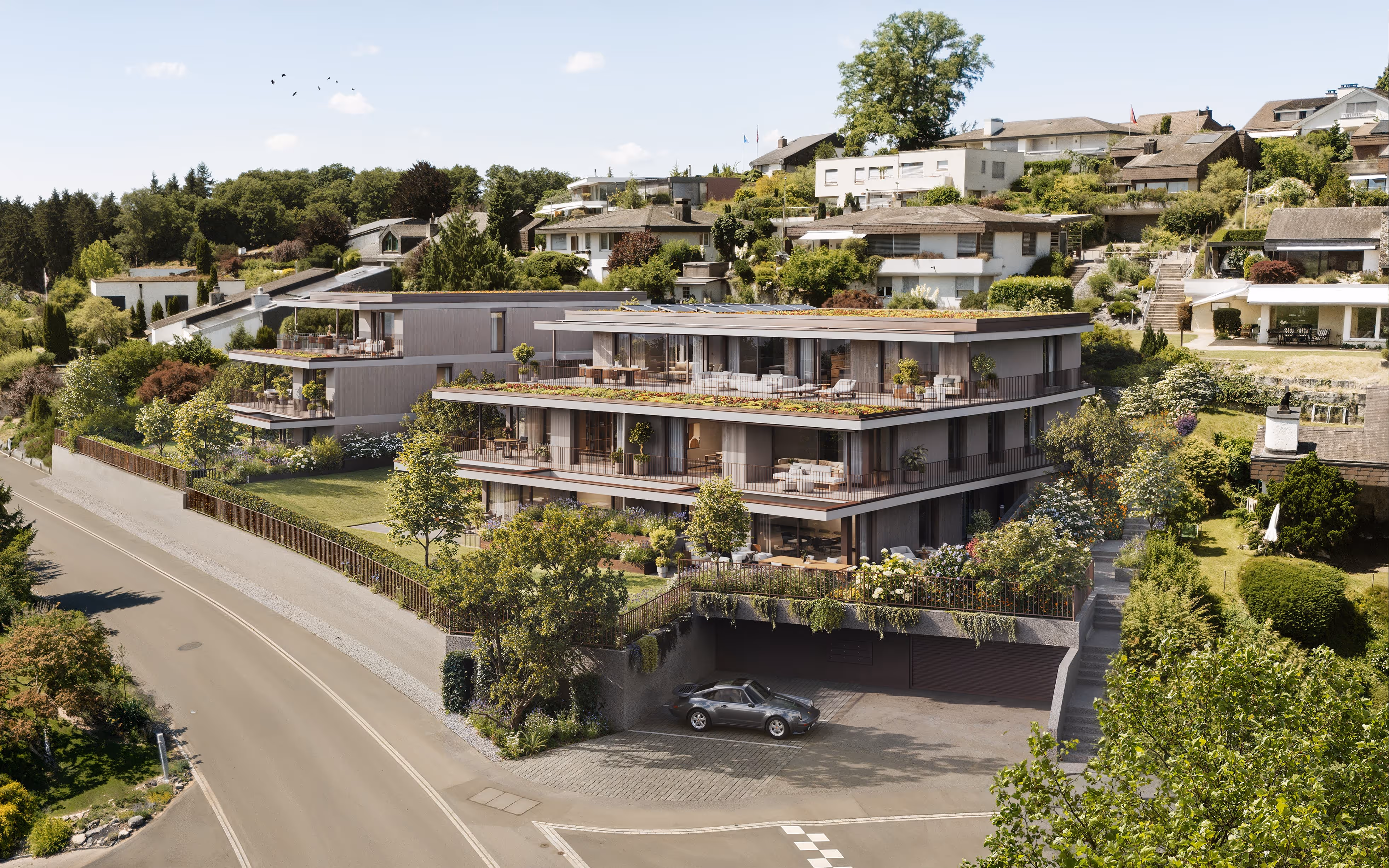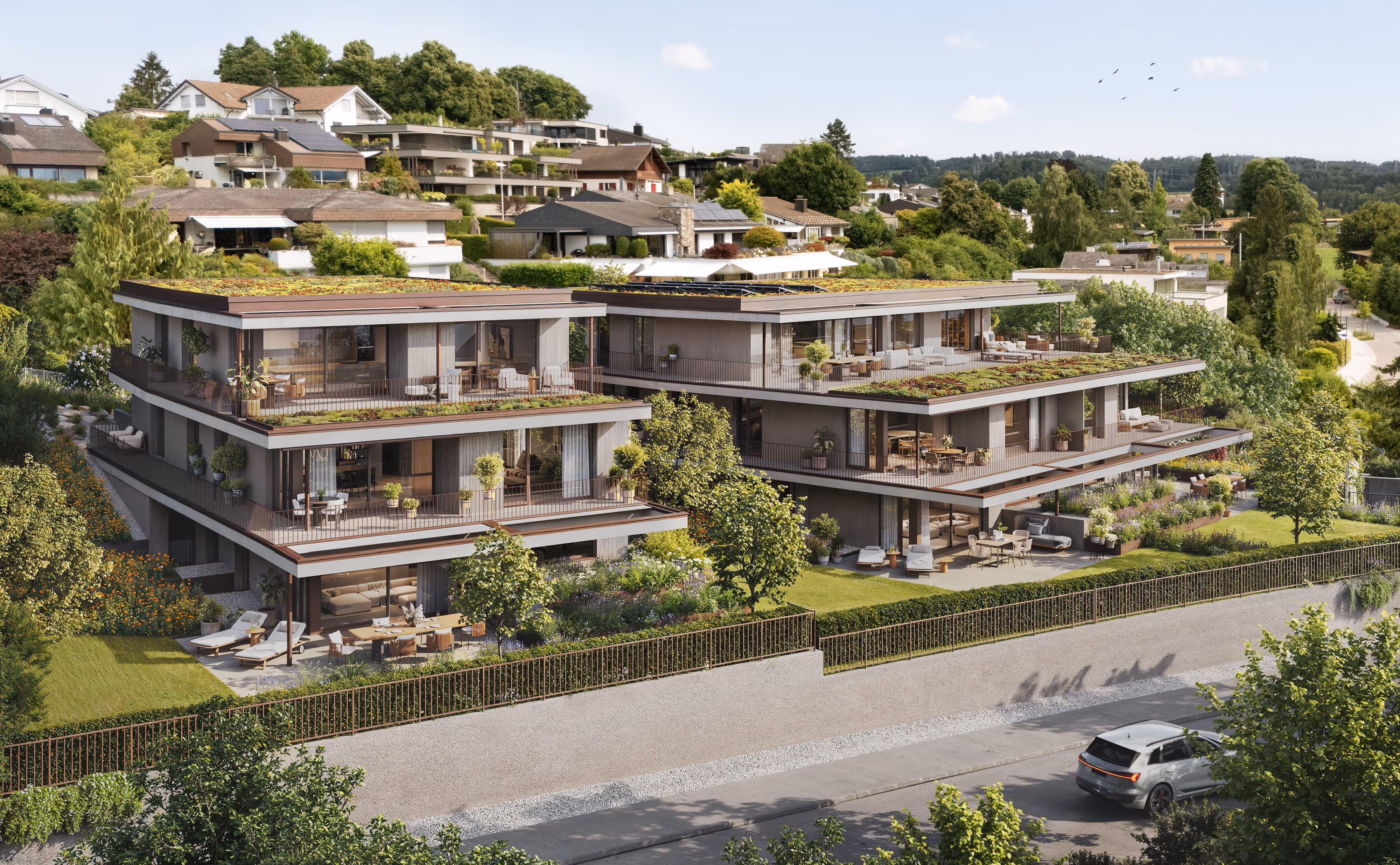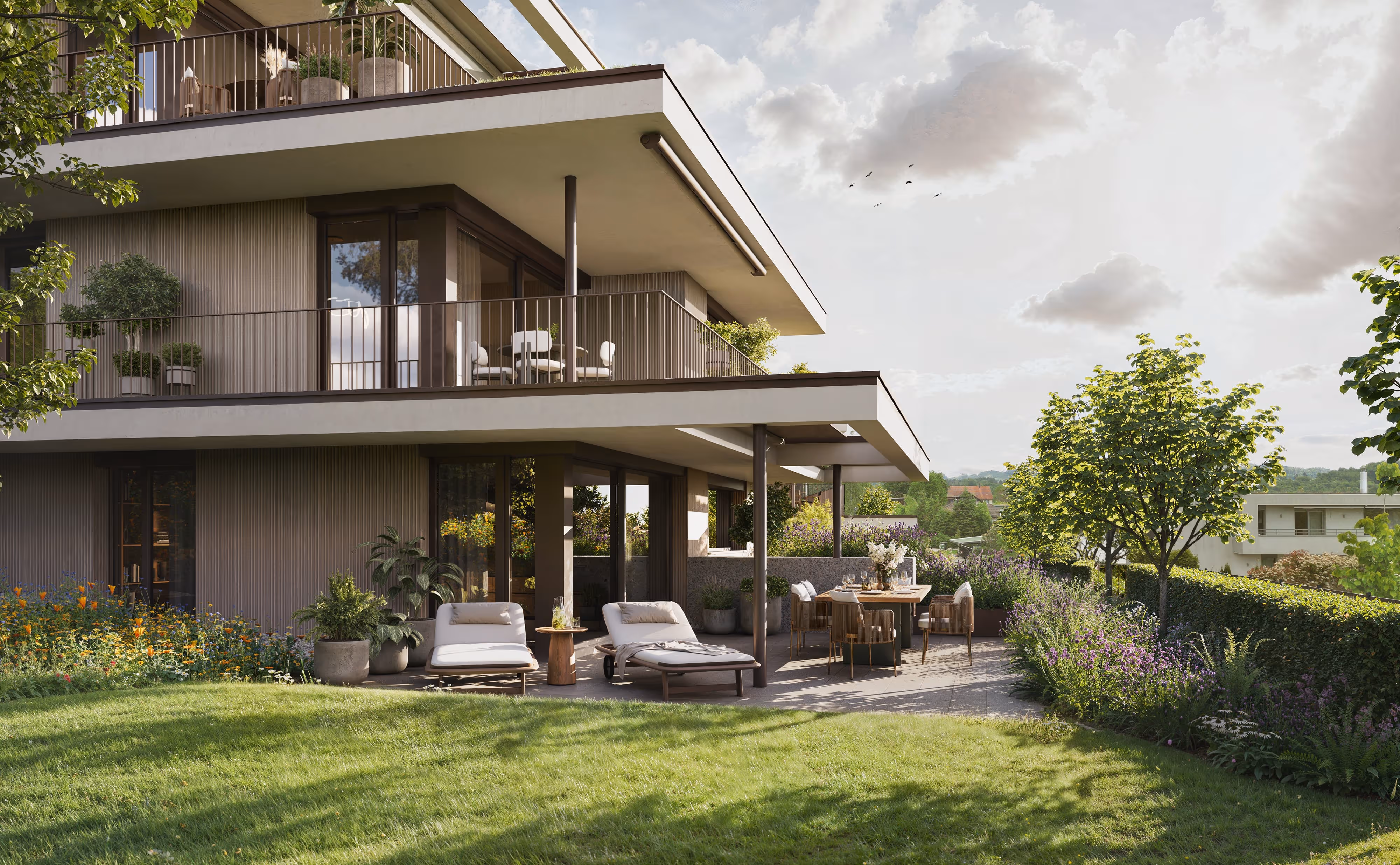 Zwei hochwertige Mehrfamilienhäuser mit acht eleganten Eigentumswohnungen, die durch offene Räume, grosszügige Terrassen und idyllische Gärten ein harmonisches Wohngefühl schaffen.